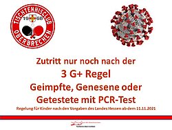 Zutritt zum TT-Raum ab sofort nur noch nach der 3 G+ Regel: Geimpfte, Genesene oder Getestete mit PCR-Test.