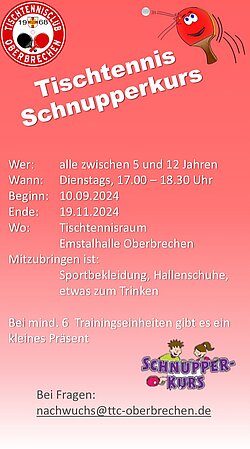 Am 25.06.2019 endete der 4-wöchige Schnupperkurs des TTC Oberbrechen in der Kulturhalle in Niederbrechen. Insgesamt 14 Jungen und Mädchen haben im…